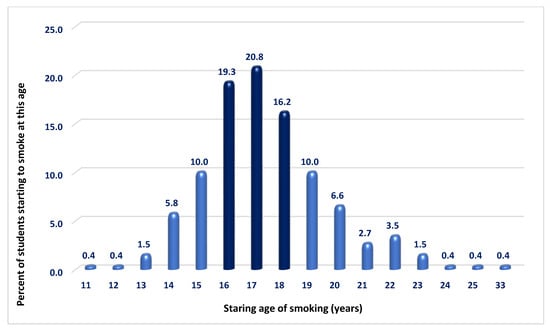 Among the 259 ever-smokers, the average age of smoking initiation was 17.38 ± 2.43 years (range 11–33 years). Smoking most often began at ages 17 (20.8%) and 16 (19.3%). About 18.1% started before age 15, and by age 17, the cumulative percentage rose to 58.3%. By ages 18 and 19—typically the age for completing school education —74.5% and 84.6% of the respondents had started smoking, respectively. Only about 15% initiated the habit after that age (Figure 2). No statistically significant differences were found between groups or sexes regarding initiation before or at ages 14, 16, or 18 (Supplementary Tables S15 and S16). The average duration of active smoking was 4.59 ± 2.82 years (range 1–15 years). Again, no significant differences were found between the two student groups or between sexes regarding the age of initiation or total duration of active smoking (Supplementary Table S17).