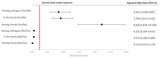Binary logistic regression analysis, adjusted for age and sex, was performed to establish whether the presence of second-hand smoke in any of the three environments was a risk factor for being an ever-smoker. The respondents who declared being subjected “Frequently” or “Always” to second-hand smoke were considered exposed, while those who declared “Rarely” or “Never” were considered not exposed (Figure 3). Exposure among friends posed the highest risk—about nine times higher (aOR 8.920; 95% CI 5.878–13.538)—followed by exposure in the family (aOR 3.704; 95% CI 2.612–5.253) and among colleagues (aOR 3.441; 95% CI 2.418–4.897). Conversely, if the absence of exposure was viewed as a protective factor against taking up smoking, a lack of it in the family reduced the risk by 73%, a lack amongst colleagues by 71%, and a lack amongst friends by 89%.