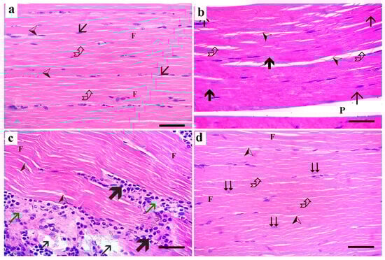 A photomicrograph of H&E-stained longitudinal section in the right gastrocnemius muscle. (a) Control group shows cylindrical elongated non-branched muscle fibers (F). The muscle fibers have acidophilic cytoplasm with transverse striations (arrowhead) and numerous flattened peripheral nuclei (arrow). Each muscle fiber is surrounded by a narrow endomysium (curved arrow). (b) Dyslipidemic group showing splitting (arrowhead) with increased endomysial spaces (curved arrow) and loss of striations (thin arrow). Some fibers with regular striations are also seen (thick arrow). Perimysium (P) is seen between skeletal muscle bundles. (c) simvastatin-treated group showing wavy muscle fibers with lost transverse striations (F), pale homogenous parts of some fibers (green arrow), splitting (arrow heads), areas of rarified cytoplasm (thin arrow) and sarcoplasmic cellular infiltration (thick arrow). (d) Spirulina platensis-treated group showing cylindrical muscle fibers (F) arranged in parallel with narrow endomysium in between (curved arrow). Some fibers with central vesicular nuclei are present (double arrow). Minimal splitting of muscle fibers is observed (arrowhead). (H&E, X 400, scale bar, 30 µm).