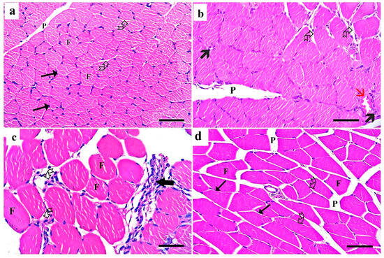 A photomicrograph of H&E-stained transverse sections of gastrocnemius muscle. (a) Control group shows polyhedral muscle fibers (F) with peripheral nuclei (arrow) and acidophilic cytoplasm that are separated by narrow endomysium (curved arrow). The perimysium (P) is seen between muscle bundles. (b) Dyslipidemic group showing increased endomysial spaces (curved arrow), some inflammatory cell infiltrate (thick arrow), and congested blood vessel (red arrow). Note the perimysium (P) between skeletal muscle bundles. (c) Simvastatin-treated group showing variably sized muscle fibers exhibiting acidophilic sarcoplasm with nonclear myofibrils (F). Wide endomysial spaces are present between the muscle fibers with cellular infiltration (curved arrow). Note cellular infiltration also (thick arrow) in the perimysium. (d) Spirulina platensis-treated group showing polyhedral muscle fibers (F) with peripheral nuclei (arrow) and acidophilic cytoplasm separated by narrow endomysium (curved arrow). Note the perimysium (P) between muscle bundles. (H&E, X 400, scale bar, 30 µm).