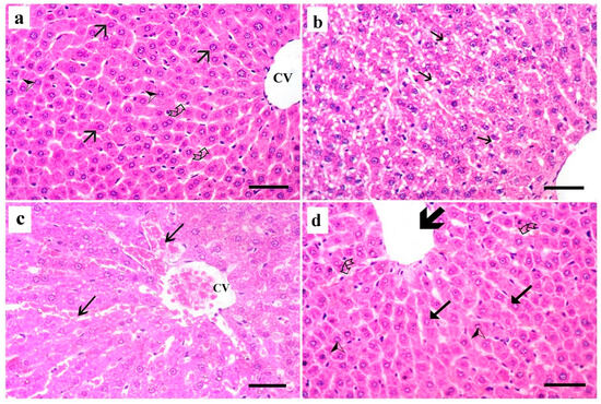 H&E-stained section of liver tissue. (a) Control group shows normal hepatocytes (arrow) with vesicular nuclei (arrowhead) around the normal central vein (CV). Blood sinusoids (curved arrow) appear normal, separating hepatocyte cords. (b) Dyslipidemic group shows most hepatocytes with vacuolated cytoplasm (arrow). (c) Simvastatin-treated rats showing congestion of central vein (CV) and blood sinusoids (arrow). (d) Spirulina platensis-treated group shows almost normal hepatic architecture with normal hepatocytes that are polyhedral in shape (arrow) and exhibit normal arrangements and central vesicular nuclei (arrowhead). Mild congested blood sinusoids (curved arrow) and average-sized central vein (thick arrow) are seen. (H&E, X 400, scale bar, 30 µm).