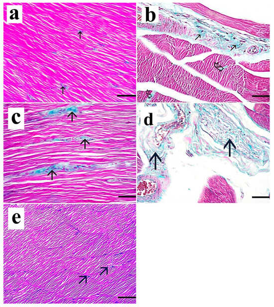 Masson trichrome-stained sections of the right gastrocnemius muscle. (a) Control group shows few collagen fibers between muscle fibers (arrow). (b) Dyslipidemic group shows a moderate increase in the collagen fibers in the perimysium (arrow) and also in the endomysium (curved arrow). (c,d) Simvastatin-treated group shows marked increase in the collagen fibers between the muscle fibers (arrow) and in the collagen fibers in the wide perimysium between the muscle bundles (arrow). (e) Spirulina platensis-treated group shows a few collagen fibers between muscle fibers (arrow). (Masson trichrome, X 400, scale bar, 30 µm).