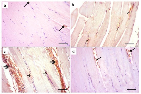Immunohistochemical stained gastrocnemius muscle longitudinal sections for anti-TGFβ1. (a) Control group shows scanty brownish immunostained cells in the endomysium (arrow) between skeletal muscle fibers. (b) Dyslipidemic group shows some brownish immunostaining in the endomysium (arrow) between skeletal muscle fibers. (c) Simvastatin-treated group showing excessive brownish cytoplasmic immunostaining in the cells in the endomysium (thin arrow) and perimysium (thick arrow). (d) Spirulina platensis-treated group shows a few brown immunostained cells (arrow) in the endomysium between skeletal muscle fibers. (Immunoperoxidase technique for TGFβ1, X 400, scale bar, 30 µm).