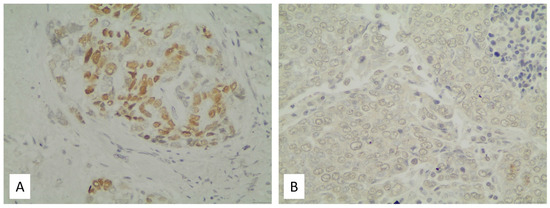 PROX1 expression detected in NSCLC tissues (representative). (A): Intense PROX1 staining in a case of adenocarcinoma; (B): a low expression pattern in a case of squamous cell carcinoma.