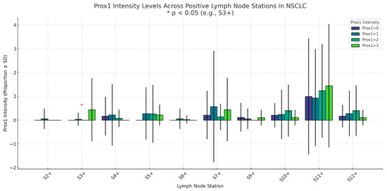 Assessment of TNM parameters revealed no significant relationship with PROX1 expression. PROX1 expression in relation to tumor stage, size, and nodal status is presented in detail in Table 4. While reduced expression tended to occur in advanced T stages (T3–T4), this was not statistically significant (p = 0.101). Similarly, nodal status exhibited no association with PROX1 expression (p = 0.884), with comparable expression patterns throughout the N0 to N2 categories. As already indicated, all patients were M0, precluding the presence of distant metastases. Tumor stage exhibited a non-significant trend (p = 0.097), with decreased expression more likely in early-stage disease. Notably, lesion diameter varied substantially by PROX1 expression (p = 0.026). More specifically, tumors with a much greater diameter were found in the group with the lowest PROX1 expression (mean 5.36 ± 3.07 cm), whereas the smallest tumors were found in the 26–50% group (mean 3.52 ± 1.71 cm). These findings are indicative of an inverse relationship between lesion size and PROX1 expression. Lymph node metrics—including the number dissected (p = 0.811), positive nodes (p = 0.435), and lymph node ratio (p = 0.958)—did not differ among groups. However, high PROX1 intensity (score 3) was significantly associated with nodal metastases to station 3 (S3) (mean involvement: 0.44 ± 1.33 nodes; p = 0.025) (Figure 2).