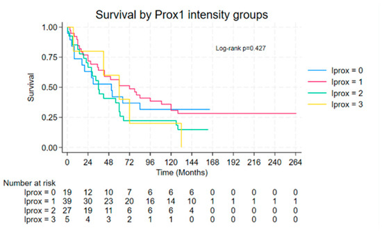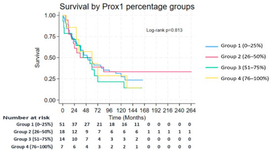 Kaplan–Meier survival analysis revealed no statistically significant association between either PROX1 staining intensity or percentage expression and OS in the studied cohort (p > 0.05; Figure 3 and Figure 4). On the other hand, a number of clinicopathological variables exhibited noteworthy prognostic value, as demonstrated in Table 6. Patients younger than 50 years (p = 0.021), of female sex (p = 0.006), and those without tumor necrosis (p = 0.043) had a significant superior survival outcome. Lymph node involvement served as one of the most important prognostic factors. More specifically, subjects with fewer than 10 positive lymph nodes had a markedly superior median OS (60 months) compared to those with 10 or more positive nodes (17 months; p < 0.001). Similarly, a lymph node ratio (LNR) < 0.5 corresponded to a median OS of 60 months, while an LNR ≥ 0.5 was associated with only 14 months (p = 0.018). Analysis of the site of nodal metastases revealed the negative prognostic implications of extensive lymphatic spread in survival. Involvement of more than four nodes at particular stations was notably correlated with a significant reduction in OS. In detail, nodal involvement at stations 5 (subaortic), 10 (hilar), 11 (interlobar), and 12 (lobar) was associated with an OS of less than 6 months (p = 0.003), of 4 months (p = 0.038), of 20 months (p = 0.002), and of less than 6 months (p = 0.003), respectively.