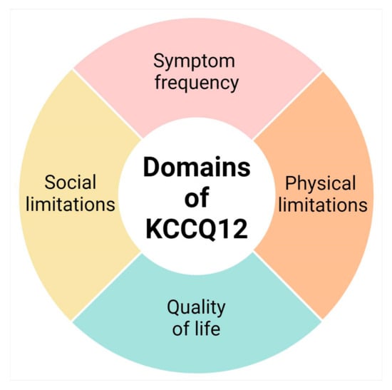 The KCCQ-12 is a validated 12-item self-reporting questionnaire that was specifically designed to assess HRQL in patients with HF [9].The questionnaire has a recall period of two weeks to account for the day-to-day variability in heart failure symptoms [9]. Although this PROM is a condensed version of the original KCCQ-23, the KCCQ-12 correlates highly with the original scales (>0.93) in all clinical settings, shows high test-retest reliability (>0.76), and is responsive to clinical changes [12]. Each of the 12 items is answered on a Likert scale, and the responses are then grouped and used to calculate a score for four different domains: physical limitation, symptom frequency, quality of life, and social limitation (Figure 1) [9].