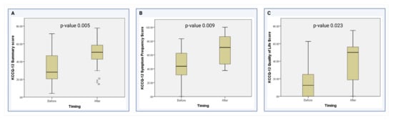 As shown in Table 4, the median KCCQ-12 overall summary score after the placement of the Impella 5.5 was significantly higher than before the device (50.52 vs. 28.13, p = 0.005) (Figure 2A). When analyzing the KCCQ-12 domains, the median scores in the symptom frequency domain (70.83 vs. 43.75, p = 0.009) (Figure 2B) and the quality-of-life domain (50 vs. 12.5, p = 0.023) significantly improved after device placement (Figure 2C). The physical limitation domain showed a non-significant trend towards improvement after device placement (62.50 vs. 50, p = 0.293). Finally, there was no difference in the social limitation domain when comparing patients before and after the placement of the Impella 5.5 (25 vs. 25, p = 0.342) at our institution.