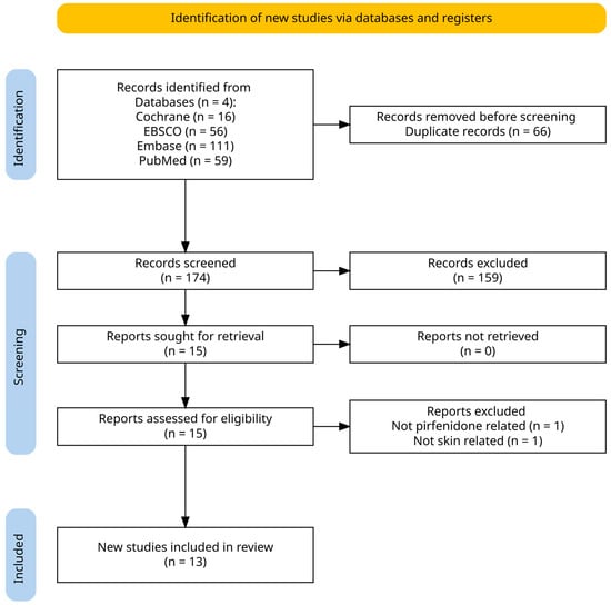 Consistent with best practices, a search was performed in Cochrane Library, EBSCO, Embase, and PubMed. Keywords and MeSH terms including “pirfenidone”, “skin”, and “scar” were used to identify records. An a priori eligibility framework and screening plan were established before the search commenced. Articles were included when they examined the use of pirfenidone for any cutaneous condition regardless of participant age, geographic location, study design, setting, or peer-review status. Both human and non-human studies were included. No limits on date, language, study design, or publication type were applied. A total of 174 records were identified after the removal of duplicates. Search data was then extracted into a standard Excel spreadsheet for review by the authors. Data from all searches were transferred to a standardized Excel sheet for analysis. Knighton and Turney independently screened the titles and abstracts, selecting 15 papers for full-text evaluation. The ensuing full-text review was performed separately by Knighton, Babun, and Evans; any discrepancies were settled through consensus discussion. Two records were excluded for irrelevance, leaving 13 studies for qualitative synthesis. No formal risk-of-bias appraisal was undertaken. Figure 1 is a PRISMA diagram of the search and screening process.