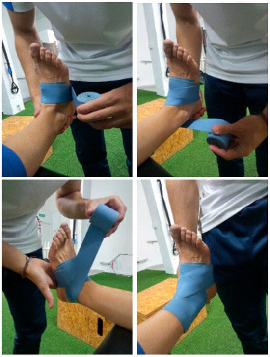 In the experimental group, with the patient barefoot, the session began with a warm-up without the elastic band, consisting of three active exercises: 1 min of walking in a straight line, 15 heel raises with weight bearing, and 15 dorsiflexion of the ankle of the lower limb to be treated in a standing position. The elastic band or flossing tape was then applied, starting transversely at the metatarsals with two passes in a caudocranial direction, from the dorsum of the foot to the first toe and passing through the sole of the foot to the fifth toe, returning to the dorsum. Once the two turns were completed, it was placed in a figure-8 shape, passing through both malleolar regions and wrapping around the Achilles tendon, descending caudally in an oblique direction to the medial part of the foot. The elastic band was passed under the sole of the foot again to start the same route, making a total of three figure-of-eight turns. The excess band was placed on the subject’s leg to secure it [20]. The elastic band used was blue and measured 5 cm wide, 200 cm long, and 1.3 mm thick. Figure 1 shows the placement of the flossing.