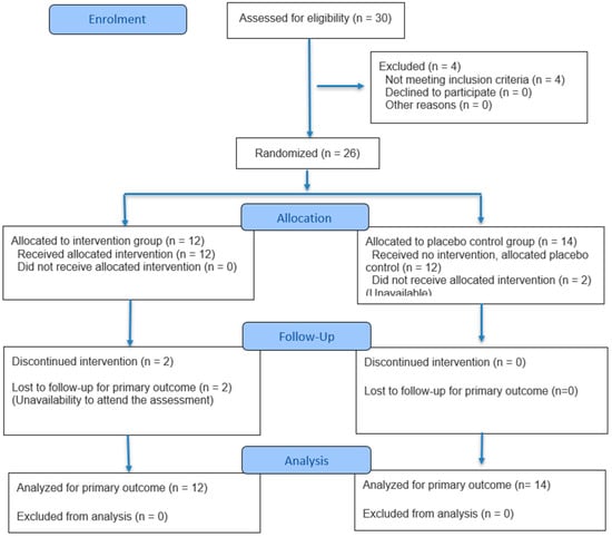 Of the 30 subjects invited to participate in the study, 26 met the selection criteria and agreed to take part. During the experimental phase, two participants withdrew from the study. In the follow-up assessment, two subjects were unable to participate for various reasons. Finally, 22 people completed the study. Figure 2 shows the flow chart of the study.