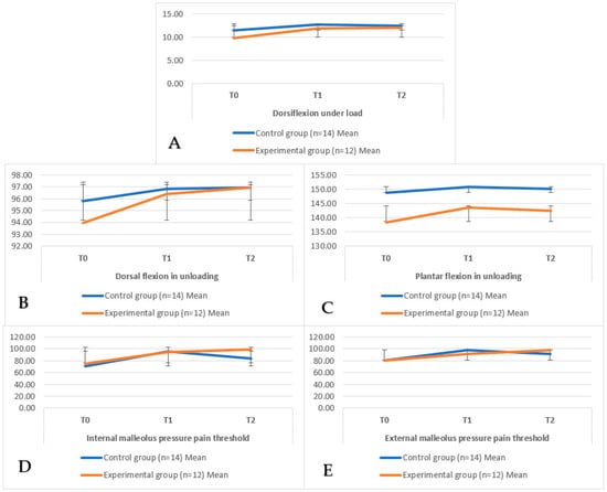 (A) Dorsiflexion under load; (B) Dorsal flexion in unloading; (C) Plantar flexion in unloading; (D) Internal malleolus pressure pain threshold; (E) External malleolus pressure pain threshold.