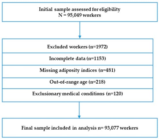 Eligible participants were adults aged 20 to 69 years, employed in any sector and having complete data on anthropometric measurements, biochemical markers, and questionnaire responses. Individuals were excluded if they were pregnant, had known metabolic or endocrine disorders (e.g., thyroid dysfunction, cancer, severe renal impairment), were missing critical data for adiposity indices, or had duplicate or inconsistent records (Figure 1). These criteria align with those previously applied in similar occupational cohort studies in Spain and Europe.