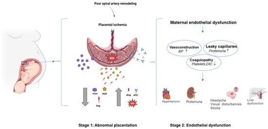 This schematic illustrates the two-stage model of preeclampsia (PE) pathogenesis. In stage 1, abnormal placentation due to poor spiral artery remodeling (black arrow) leads to placental ischemia and oxidative stress from excess reactive oxygen species (ROS, red burst). This environment disrupts the angiogenic balance, with decreased pro-angiogenic factors (PlGF, purple hexagon; VEGF, yellow hexagon; downward gray arrows) and increased anti-angiogenic factors (sFlt-1, blue antibody; sEng, pink bar; upward gray arrows). In stage 2, these factors trigger maternal endothelial dysfunction characterized by vasoconstriction (increased BP ↑ leading to hypertension), increased vascular permeability (leaky capillaries resulting in proteinuria), and coagulopathy (platelet consumption and activation leading to disseminated intravascular coagulation, DIC). Clinically, this cascade manifests as hypertension, proteinuria, neurological symptoms such as headache, visual disturbances, and stroke, as well as hepatic dysfunction, reflecting the multisystem involvement of PE. Illustration created with BioRender.com. Data adapted from references [10,11,12].