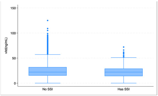 Using the Daggity tool (version 3.1) [24], a Directed Acyclic Graph (DAG) was created to identify a minimal set of covariates for the regression model (Figure S1). These confounding factors were age, BMI, gender, diabetes, hypertension, dyslipidemia, case level, operative time, preoperative albumin, length of hospital stay (LOS), and wound classification. Multivariable logistic regression analysis was conducted to examine the association between 25(OH)D levels, SSI risk, and predictors. Results were reported as odds ratios (OR) with corresponding 95% confidence intervals (CI) and p-values. p-values were used to assess the degree of evidence against the model hypothesis.