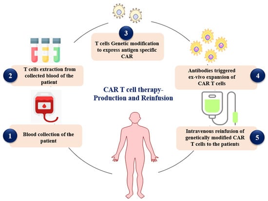 Diagrammatic representation of the process CAR-T production and reinfusion to the patients (Created in BioRender. Rabbani, S. (2025) https://BioRender.com/y6vtd5g (accessed on 24 July 2025)).