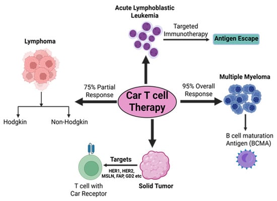 Hodgkin and non-Hodgkin are two major types of lymphoma that are traditionally treated with chemotherapy and monoclonal antibodies due to the limitation of disease deterioration that has been reported by patients in need of potential therapy. Both lymphomas have proven to be suitable to immunotherapy treatment because of their occurrence in immune-rich lymphoid tissues [32,33]. In various studies, CAR-T-cell therapy exhibited very promising results in B-cell lymphoma patients who were in a primary therapy setting [34]. In one study reported, CD19-antigen-directed CAR-T cells showed favorable outcomes in lymphoma, with patients achieving a 75% partial response. According to a clinical study by Kochenderfer et al., out of 15 patients with advanced B-cell malignancies who received CD19 CAR-T-cell therapy, 8 of them experienced complete remission, 4 showed partial remission, 2 were not responsive, and 1 had stable lymphoma [35]. In different studies, the treatment of lymphoma patients with CD19-targeted CAR-T cells has shown promising findings [36,37]. CD20-antigen-directed CAR-T cells have shown considerable results in the treatment of non-Hodgkin lymphoma patients [38,39]. Apart from the CD19 and CD20 antigens, CD30-targeted CAR-T cells have also been found to be vital in the treatment of lymphomas [40,41]. To understand and explore further the application of CAR-T cells, various clinical studies are in progress.