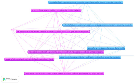 To explore collaborative patterns at the institutional level, a co-authorship analysis was conducted using organizations as the unit of analysis. As illustrated in Figure 2, the network comprises organizations that have co-authored at least two documents within the dataset. Each node represents a unique organization, and the links between nodes indicate co-authored publications, thereby reflecting inter-institutional research collaborations. The size of each node is proportional to the number of documents affiliated with that organization, while node color reflects clusters identified through modularity-based clustering using VOSviewer, signifying groups of institutions with closer co-authorship ties. The resulting map reveals a moderately fragmented network, with some densely connected clusters and a number of weaker peripheral connections. Two main clusters emerge: one predominantly composed of institutions in clinical and biomedical research (e.g., Faculty of Medical Sciences, Newcastle, Newcastle upon Tyne Hospitals, Health and Biomedical Strategi, and School of Psychology, Dublin C), and another centered around public health and nursing research (e.g., Population Health Sciences Institute, Department of Nursing, Midwife, and School of Education, Communica).