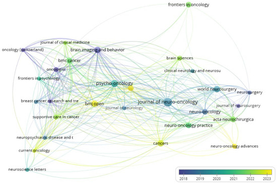 As shown, the Journal of Neuro-Oncology occupies a highly central position, with extensive bibliographic linkages, though shaded in cooler hues, suggesting that its influence is largely based on earlier publications in the timeframe. Similarly, Brain Imaging and Behavior appears in a central position but with a darker blue color, indicating that its contributions are rooted more in the earlier years of the decade. In contrast, journals such as BMJ Open and Cancers are both positioned centrally and shaded in yellow, reflecting very recent publishing activity and strong engagement with the emerging literature. Psycho-Oncology is also well-connected and shaded in green–yellow tones, indicating sustained and relatively recent contributions. More peripheral journals, such as Neuro-Oncology advances and Current Oncology contribute with fewer shared references, but their warmer hues suggest that they represent newer areas of activity and thematic expansion within cognitive oncology research. Overall, this pattern highlights a dual trend: foundational contributions from journals like Journal of Neuro-Oncology and Brain Imaging and Behavior established earlier in the decade, complemented by more recent and expanding contributions from outlets such as BMJ Open, Acta Neurochirurgica, and Neuro-Oncology Advances.