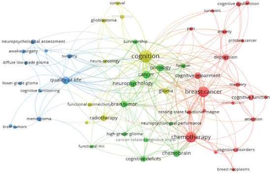 To investigate the conceptual landscape of research on neuropsychological and cognitive outcomes in oncology, a co-occurrence analysis of author keywords was conducted. This approach reveals how frequently specific terms appear together in the same documents, thereby highlighting thematic relationships and dominant areas of focus within the literature. A minimum threshold of three keyword occurrences was applied to ensure the inclusion of relevant and recurrent terms. As shown in Figure 5, the resulting network comprises several distinct clusters, each corresponding to a thematic area within the field. The yellow cluster, centered on cognition, includes terms such as glioblastoma, radiotherapy, neuro-oncology, glioma, and functional connectivity. This cluster reflects research focusing on intensive oncological treatments, biological mechanisms, and network-level brain changes associated with cognitive outcomes. The green cluster is anchored by neuropsychology and contains terms like brain tumor, cancer, oncology, chemo brain, and cognitive deficits. It represents the conceptual and methodological core of the field, emphasizing cancer-related cognitive impairment as a recognized neuropsychological outcome across tumor types and treatment modalities. The blue cluster brings together quality of life, surgery, and meningioma, highlighting the literature on neurosurgical approaches, tumor classification, and the balance between treatment efficacy and preservation of cognitive functioning and daily well-being. Finally, the red cluster is oriented toward psychosocial and chemotherapy-related dimensions, comprising terms such as breast cancer, chemotherapy, cognitive dysfunction, depression, anxiety, and memory. This cluster emphasizes the psychological and emotional burden of cancer-related cognitive impairment, particularly in breast cancer survivors. Together, these clusters provide a comprehensive map of the field, spanning mechanistic and treatment-related investigations, core neuropsychological constructs, surgical outcomes, and psychosocial aspects of cancer-related cognitive impairment.