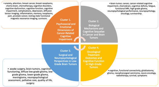 Keyword co-occurrence and co-citation analyses revealed four main thematic directions, ranging from psychosocial and emotional aspects of cancer-related cognitive impairment to biological mechanisms, surgical outcomes, and treatment-induced neurotoxicity. These themes illustrate the multifactorial nature of the field and the complementary methodologies applied across studies.