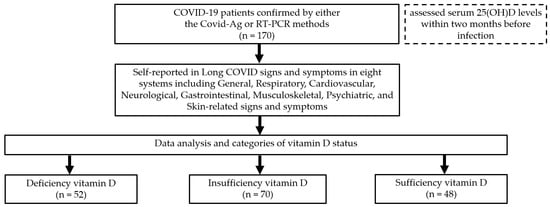 Study flow and categorization of vitamin D status in relation to long COVID signs and symptoms in COVID-19 patients.