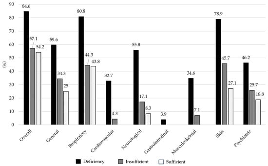 The prevalence of long COVID signs and symptoms was highest among those with vitamin D deficiency (59.6%), followed by vitamin D insufficiency (34.3%) and vitamin D sufficiency (25.0%). Similarly, the prevalence of long COVID signs and symptoms was highest (78.9–80.8%) in those with vitamin D deficiency, particularly for respiratory and skin signs and symptoms (Figure 2).