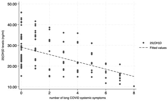 Scatter plot of the correlation between vitamin D levels and the number of long COVID systemic signs and symptoms.