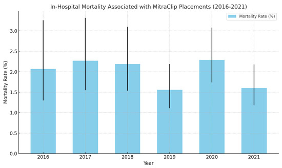 With all the above considerations, the success rate of the MitraClip in symptomatic improvement of heart failure symptoms is remarkable and is widely utilized since its FDA approval in 2013. From 2013 to 2016, there was an 84.4% annual increase in the number of clip placements [13]. The upgoing trend was sustained, with 2488 clip placements in 2021 compared to 869 in 2016 (Table 1, Figure 1). The in-hospital mortality rates related to the procedure have been generally noted to be low. A retrospective analysis conducted by a research data center in Germany noted a 3.4% mortality (all-cause) related to 13,575 MitraClip placements between 2011 and 2015 [14]. Similar trends were observed with the in-hospital mortality between 2016 and 2021, where all-cause mortality remained between 1 and 3%, with a stable trend over the years (Table 1, Figure 2). The mean total hospital charges had a general increasing trend between 2016 and 2021, with a steady decrease in trends observed with the mean length of hospital stay. The mean age for patients undergoing the procedure remained between 77 and 79, with no difference in trends across the years. Sex stratification analysis proved a 50–50 trend in clip placements. Medicare was the primary copayer in 85% of the patients that underwent MitraClip placements between 2016 and 2021.