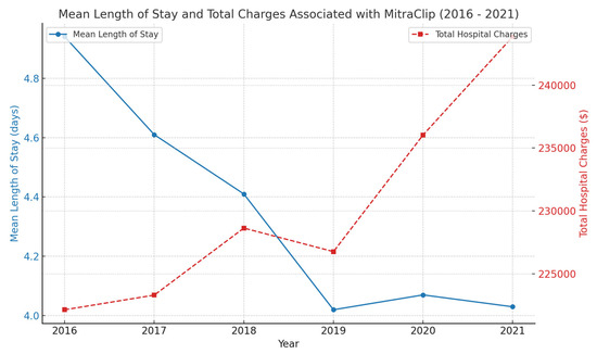 Between 2016 and 2021, there was a 186.36% increase in the total number of clip placements, with 2488 total procedures in 2021 compared to 869 in 2016. There has been a general increasing trend in the mean of total hospital charges and decreasing trend in the mean length of hospital stay, 4.94 (4.47–5.41) days in 2016 compared to 4.03 (3.71–4.34) days in 2021. Atrial fibrillation, pulmonary hypertension, and diagnosis of chronic lung diseases were factors associated with heart failure readmissions in the 90 days following the MitraClip procedure.