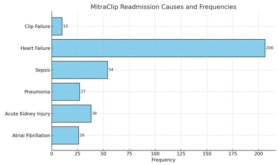 We identified 4918 Index Admissions for MitraClip placement between the months of January and September of 2021. In this Index Admission population, in the 90 days following discharge for Mitraclip placement, there were 780 readmission events. Among these readmission events, 206 events were for heart failure-related readmissions. There were 10 recorded readmissions for clip failure. Major readmission causes in the 90 days following MitraClip placement are summarized in Figure 4.