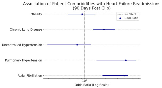 We analyzed patient comorbidities that held significant association for heart failure readmissions in the 90 days following discharge for MitraClip procedures. Results are summarized in Table 2. Forest plots for association for the MitraClip are summarized in Figure 5. Atrial fibrillation, pulmonary hypertension, and chronic lung disease were conditions that held significant association with 90-day heart failure readmissions after MitraClip.