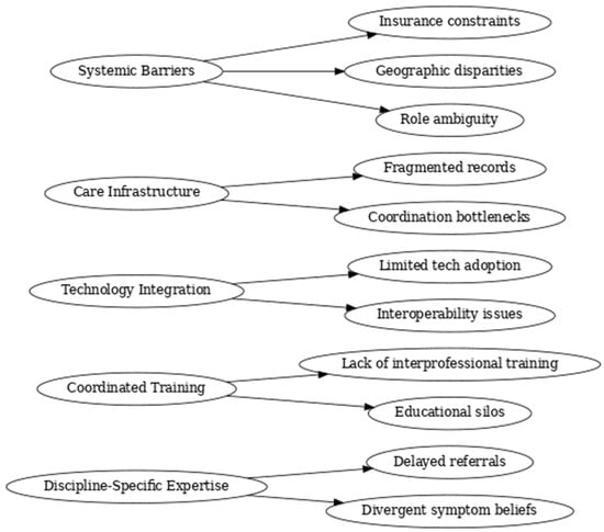 Thematic saturation was deemed achieved prior to the completion of all 94 interviews, as minimal novel concepts emerged after the 80th transcript. The final clustering of themes into superordinate categories was reviewed collaboratively among the research team to ensure conceptual validity and intersubjective agreement. These categories included: Systemic Barriers, Care Infrastructure, Technology Integration, Coordinated Training, and Discipline-Specific Expertise (See Figure 1).