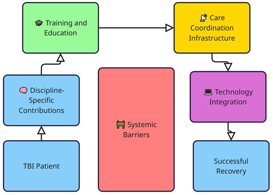 This model illustrates the proposed conceptual framework for interdisciplinary care in mild traumatic brain injury (mTBI) rehabilitation, derived from a synthesis of literature and 94 professional interviews. The framework begins with the TBI patient and emphasizes the importance of discipline-specific contributions, which feed into ongoing training and education. These educational structures support the development of care coordination infrastructure, which in turn enables technology integration to enhance communication, monitoring, and personalized interventions. Systemic barriers, including fragmented communication, reimbursement limitations, and role ambiguity, act as central impediments across all domains. Ultimately, the framework aims to support successful recovery by fostering dynamic, patient-centered, and technologically supported interprofessional collaboration.