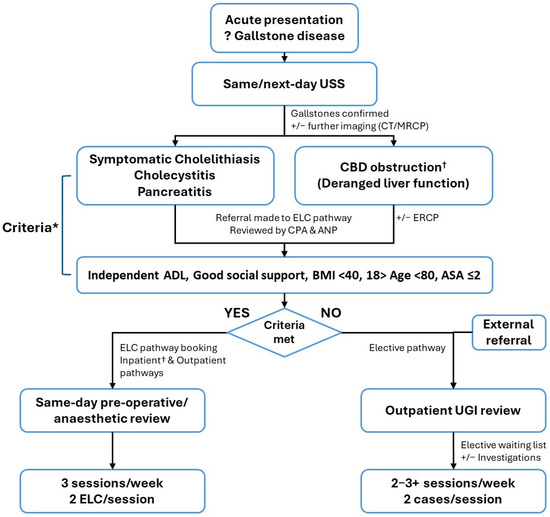 The selection criteria for the ELC pathway are summarised in Figure 1. Patients presenting acutely with a clinical and radiological diagnosis of symptomatic cholelithiasis, calculous cholecystitis, or gallstone pancreatitis, as well as those with successful clearance of common bile duct obstruction via ERCP, are eligible for ELC if they meet the following criteria: independent activities of daily living, adequate social support, BMI < 40, age between 18 and 80 years, and ASA score ≤ 2. On occasion, patients outside these criteria (e.g., ASA 3+) were pragmatically included in the ELC pathway based on clinical judgment and availability of an experienced upper gastrointestinal surgeon. Cases not meeting the ELC criteria were referred to an upper gastrointestinal (UGI) surgeon for assessment and management in the elective setting. Any patient aged over 18 years with gallstone disease requiring cholecystectomy and deemed suitable for general anaesthesia was eligible for inclusion in the elective surgery pathway. Patients were also referred to the elective pathway via external routes, such as community practitioners.