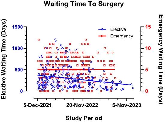 Waiting time for elective and emergency surgery during the study period.
