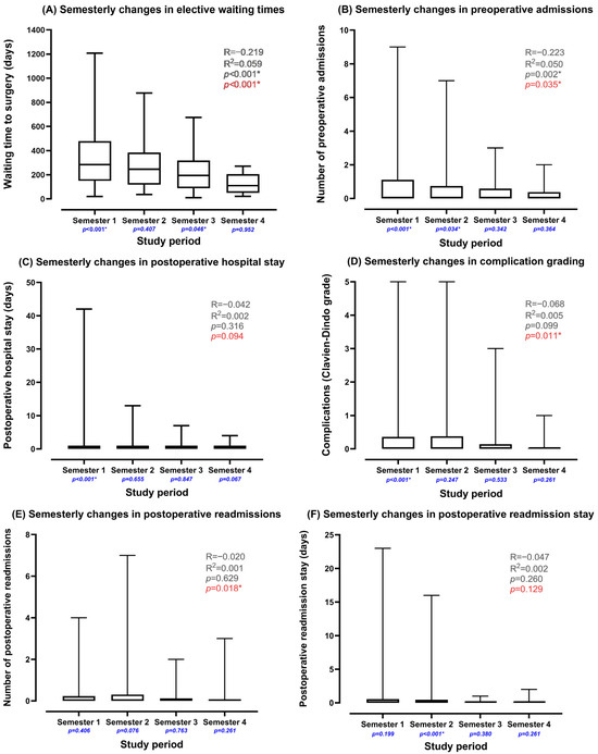 The introduction of the emergency pathway significantly reduced elective surgery waiting times from a median of 284 days (~9 months) in the first study semester to 110 days (~3 months) in the final semester (R = −0.219, R2 = 0.059, p < 0.001, Figure 2 and Figure 3A). This was coupled with an increased rate of first-presentation surgeries (81.2–81.4%, p < 0.001). Preoperative admissions were significantly reduced throughout the study period (R = −0.223, R2 = 0.050, p = 0.002, Figure 3B), with substantial improvements in the first and second semesters (p < 0.001 and p = 0.034, respectively), although the significance diminished in later semesters. Postoperative hospital stay was significantly reduced in the first semester (p < 0.001), with a non-significant reduction across the full study period (Figure 3C). There was a significant reduction in postoperative complication grading and readmissions between the first and final semesters (p = 0.011 and p = 0.018, Figure 3D,E, respectively), although these correlations were not significant when considering the entire study period. Total readmission stays were significantly reduced in the second semester (p < 0.001), though the reduction was not statistically significant across the full study period (Figure 3F).