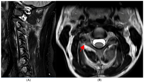 (A,B): MRI scan after emergency admission following a motor vehicle accident. (A) Sagittal FLAIR- and (B) axial T2-weighted scans documenting a diastatic fracture of the right facet and pedicle of C3 (AO Spine C3, F3, N0) without spinal compression (red arrow).