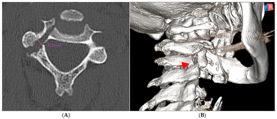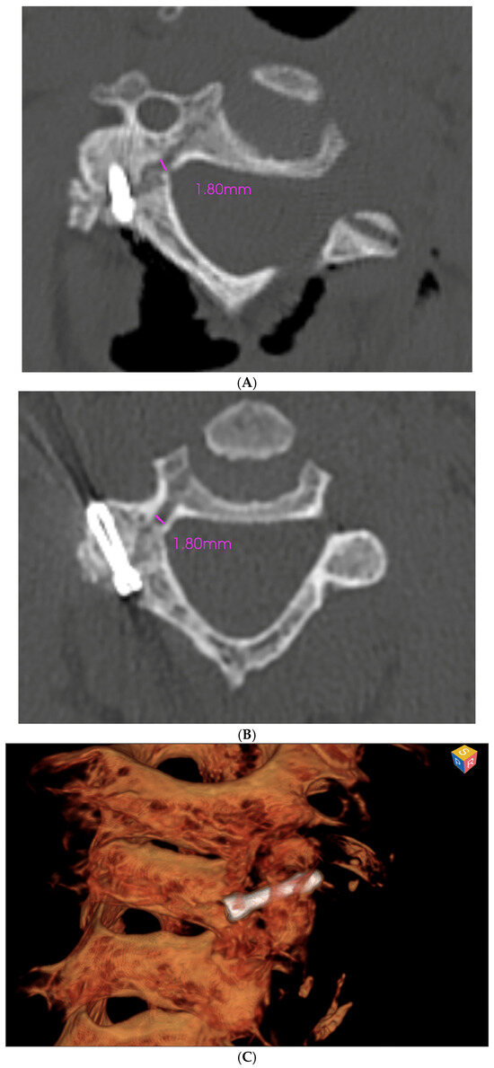 A 30-year-old woman presented with isolated neck pain after a motor vehicle collision resulting in a right C3 lateral mass and pedicle fracture (AO Spine C3, F3, N0) (Figure 1A,B). No signs of transverse foramen breach with vertebral artery involvement were present in the radiological examination (e.g., intraforaminal hematoma, vessel asymmetry or signal voids); therefore, a CT Angiography was waived due to the patient’s concerns regarding administered contrast.