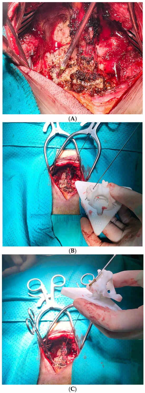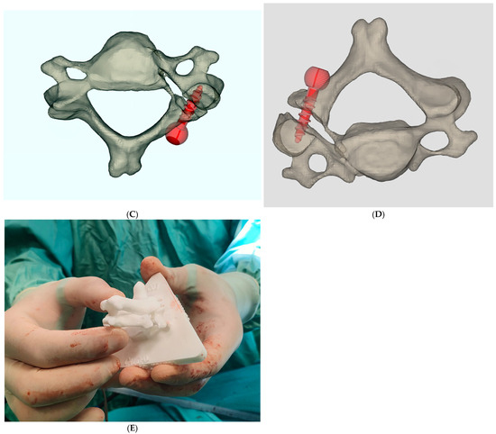 A patient-specific surgical aid was created using the My Spine MC system (Medacta International, Castel San Pietro, Switzerland) to optimize the Herbert screw’s trajectory and placement (Figure 3A–E). This system is designed to help surgeons in preoperative planning, allowing 3D visualization based on the patient’s individual anatomy. This planning phase consisted of a detailed assessment of the vertebral anatomy and fracture configuration, enabling precise preoperative modeling and simulation. The ability to create a 3D rendering of the fractured vertebra was crucial for different reasons: firstly, it aided the planning of the trajectory in an abnormal anatomy; secondly, the rendering allowed us to specifically design the trajectory of the screw with which we were not familiar; and lastly, the mentioned software allowed us to create a 3D-printed model of the fractured vertebra that was used for preoperative insertion point and trajectory simulation.