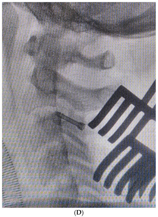 Under general anesthesia, the patient was placed prone with her cervical spine immobilized to maintain stability. A posterior midline approach exposed the posterior aspect of the C3 vertebra while minimizing tissue disruption. Through the use of the custom guide generated by the My Spine MC system, a Herbert screw was inserted into the fracture site with meticulous attention given to anatomical reduction and proper screw alignment (Figure 4A–C). Intraoperative fluoroscopy confirmed correct positioning (Figure 4D).