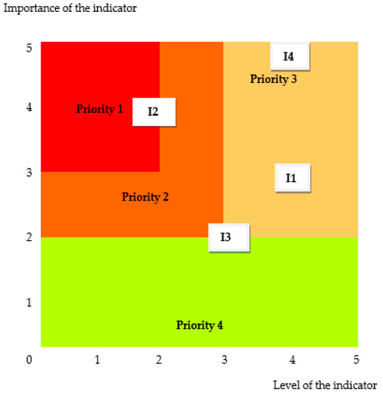 It is an Eisenhower matrix in which the importance and urgency of treating the indicators is given by framing between the extremes of high priority (1) and low priority (4). The highest priority must be given to the indicator (I2)—Correct separation and recycling of waste.