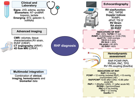 Diagnostic modalities in right heart failure. Figure author-generated using BioRender. RHF: right heart failure; JVD: jugular vein distension; FAC: fractional area change; TAPSE: tricuspid annular plane systolic excursion; RVMPI: right ventricular myocardial performance index; TDI: tissue doppler imaging; RV: right ventricle; RA: right atrium; GLS: global longitudinal strain; RVEF: right ventricular ejection fraction; CMR: cardiac magnetic resonance; CT: computed tomography; 4D flow MRI: four-dimensional flow magnetic resonance imaging; RAP: right atrial pressure; PCWP: pulmonary capillary wedge pressure; PAPi: pulmonary artery pulsatility index; RVSWI: right ventricular stroke work index; PAC: pulmonary arterial compliance; TPG: transpulmonary gradient; Ees: end-systolic elastance; Ea: pulmonary arterial elastance.