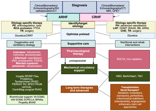 RHF complicates up to 40% of left ventricular assist device (LVAD) implantation, significantly worsening prognosis. Mechanisms include increased venous return, interventricular septal shift and preexisting pulmonary hypertension [96]. Management involves preoperative optimization with aggressive decongestion; intraoperative strategies to minimize transfusion and cardiopulmonary bypass times; postoperative treatment including inotropes (milrinone, dobutamine) and inhaled pulmonary vasodilators (nitric oxide, prostacyclin analogues, milrinone), which reduce pulmonary pressures and improve RV-arterial coupling; mechanical RV support in refractory cases [96,97,98,99].