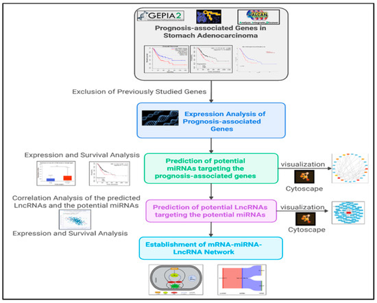 Although the ceRNA regulatory network has been studied in STAD in prior research [20,21], this study adopts a different methodology through analysis and integration of results using different databases (GEPIA, UALCAN, Kaplan-Meier plotter, miRNet, and StarBase). It incorporates modern analytics to construct a unique “mRNA-miRNA-lncRNA” framework that allows for the discovery of ceRNA components with prognostic value in STAD, linking molecular interactions to patient outcomes and enhancing precision medicine.