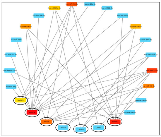 Construction of NALCN/ELAVL3/TPST1/CALCR/MYOZ3/TIGD6 and CPT1C-miRNA network by miRNet database and visualization by Cytoscape software (v3.10.3).