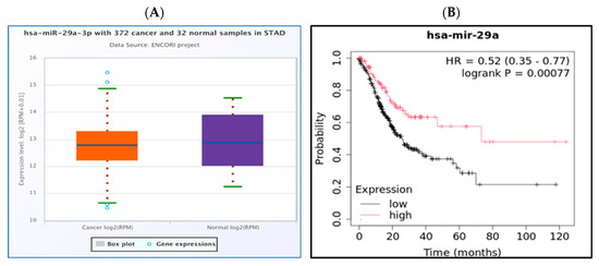 Expression of has-mir-29a-3p in STAD compared to normal tissue. The bioinformatics analysis presented in this figure was performed using starBase (http://starbase.sysu.edu.cn) (A). Prognostic value of the downregulated has-mir-29a-3p expression in STAD. The bioinformatics analysis presented in this figure was performed using Kaplan Meier plotter (http://kmplot.com/analysis/) (B).