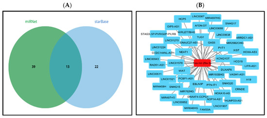 Prediction of upstream lncRNAs potentially binding to hsa-mir-29a-3p (A). miRNA–lncRNA regulatory network by miRNet using Cytoscape software (v3.10.3) (B).