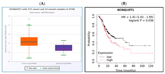 Expression of KCNQ1OT1 lncRNA in STAD. The bioinformatics analysis presented in this figure was performed using starBase (http://starbase.sysu.edu.cn) (A). Survival analysis of KCNQ1OT1 expression in STAD. The bioinformatics analysis presented in this figure was performed using Kaplan Meier plotter (http://kmplot.com/analysis/) (B).