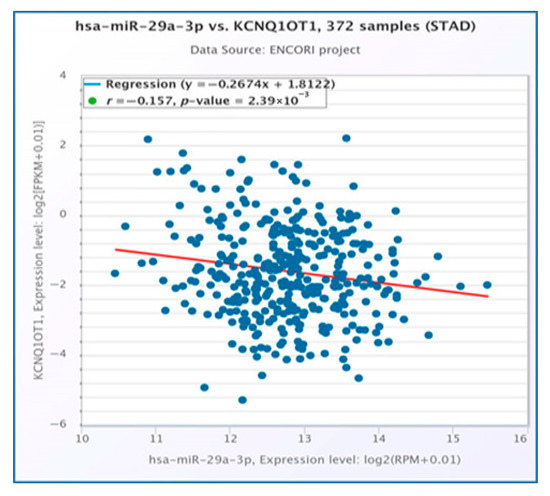 Through the integration of expression and survival analyses, we identified a single lncRNA, KCNQ1OT1, which was significantly upregulated in STAD using the StarBase database (Figure 5A). Furthermore, its upregulation was associated with poor prognosis as determined by the Kaplan-Meier plotter (Figure 5B). Furthermore, we found that KCNQ1OT1 was significantly negatively correlated with hsa-mir-29a-3p (Figure 6). The current findings support that KCNQ1OT1 is upregulated in STAD, correlated with poor prognosis significantly negatively correlated with hsa-mir-29a-3p. This might be a potential lncRNA that binds to the previously identified miRNA, hsa-mir-29a-3p.